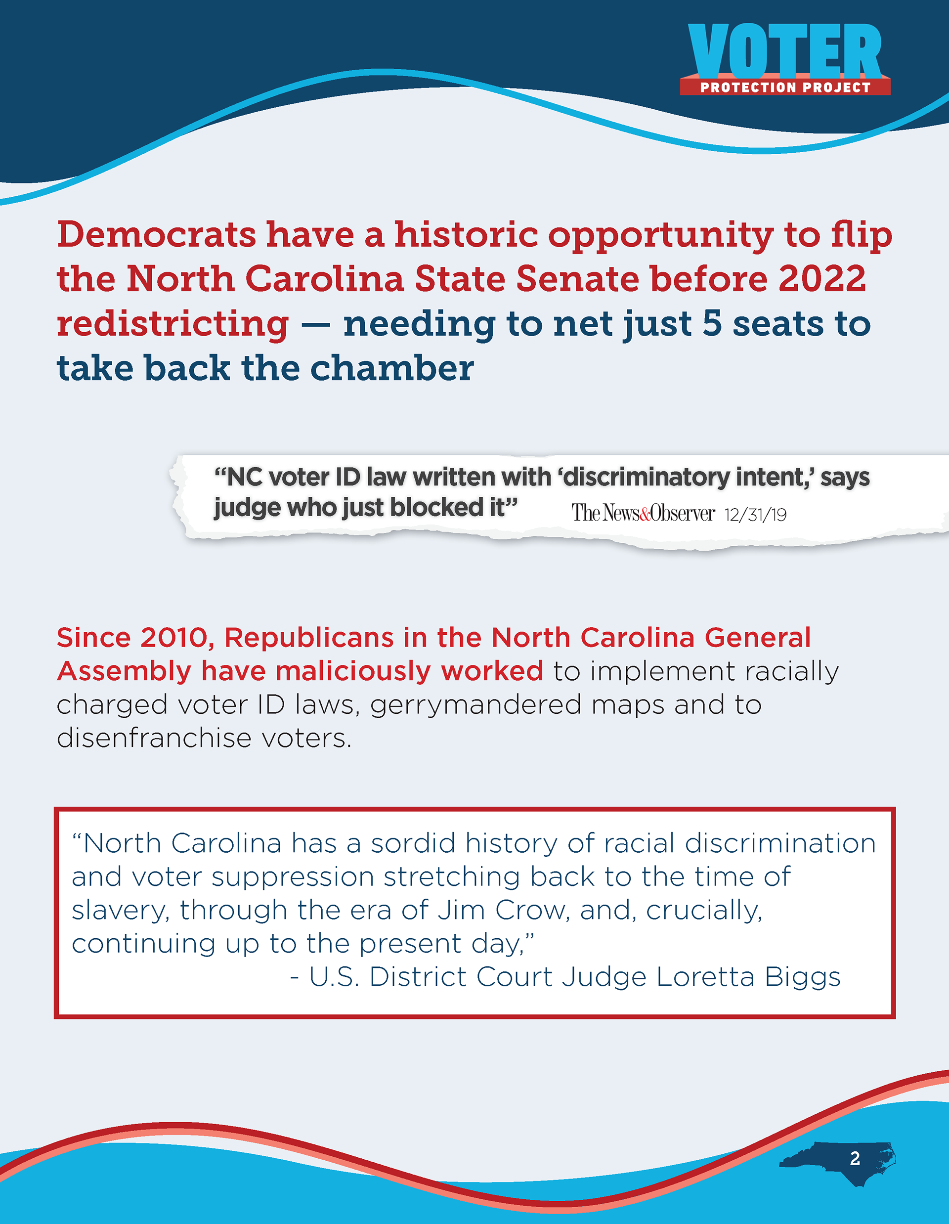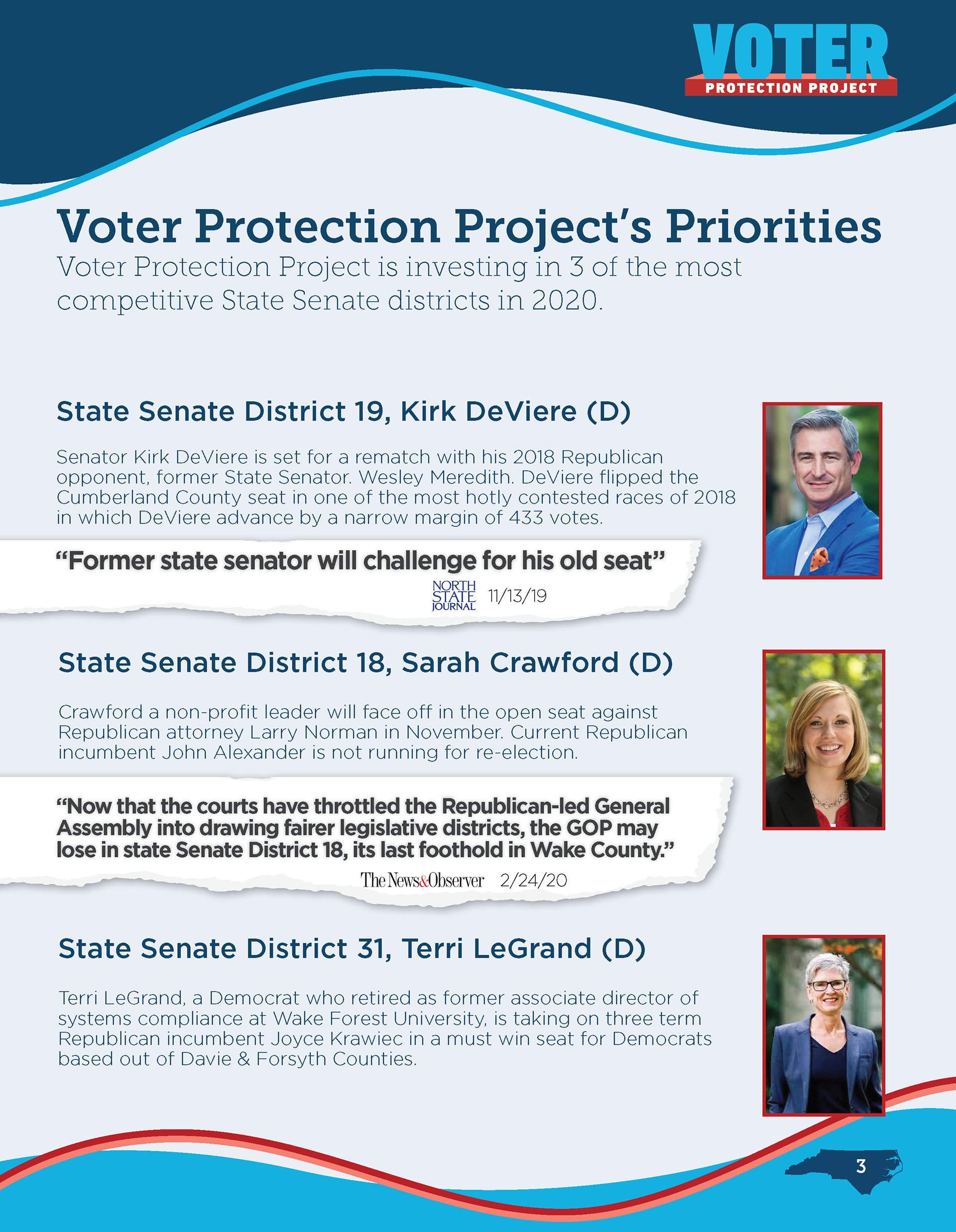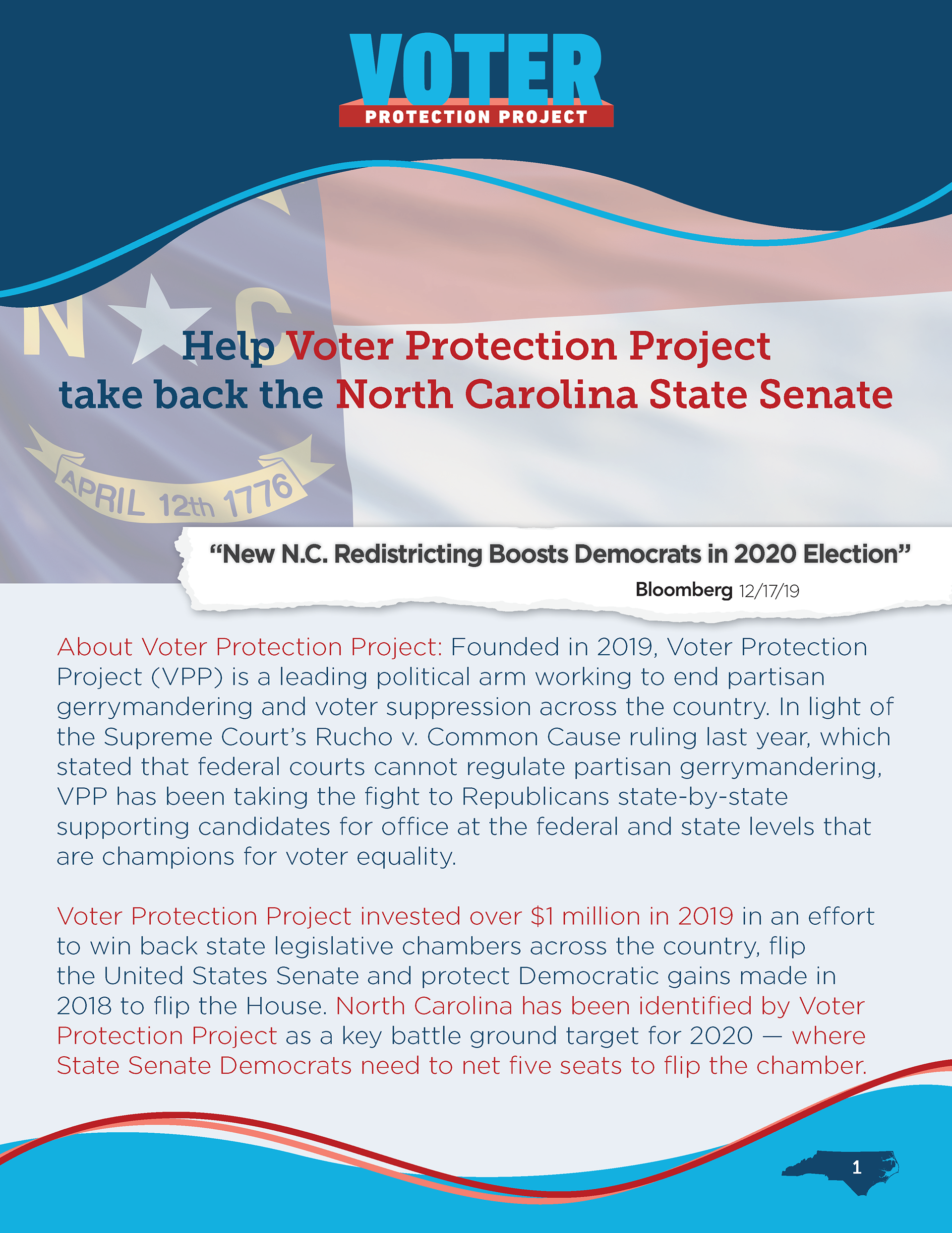 The Voter Protection Project wanted a prospectus to explain who they are, their mission, and how that is relevant to the State of North Carolina. The tone is informational with an emphasis on showing and understanding of NC State Senate issues.
