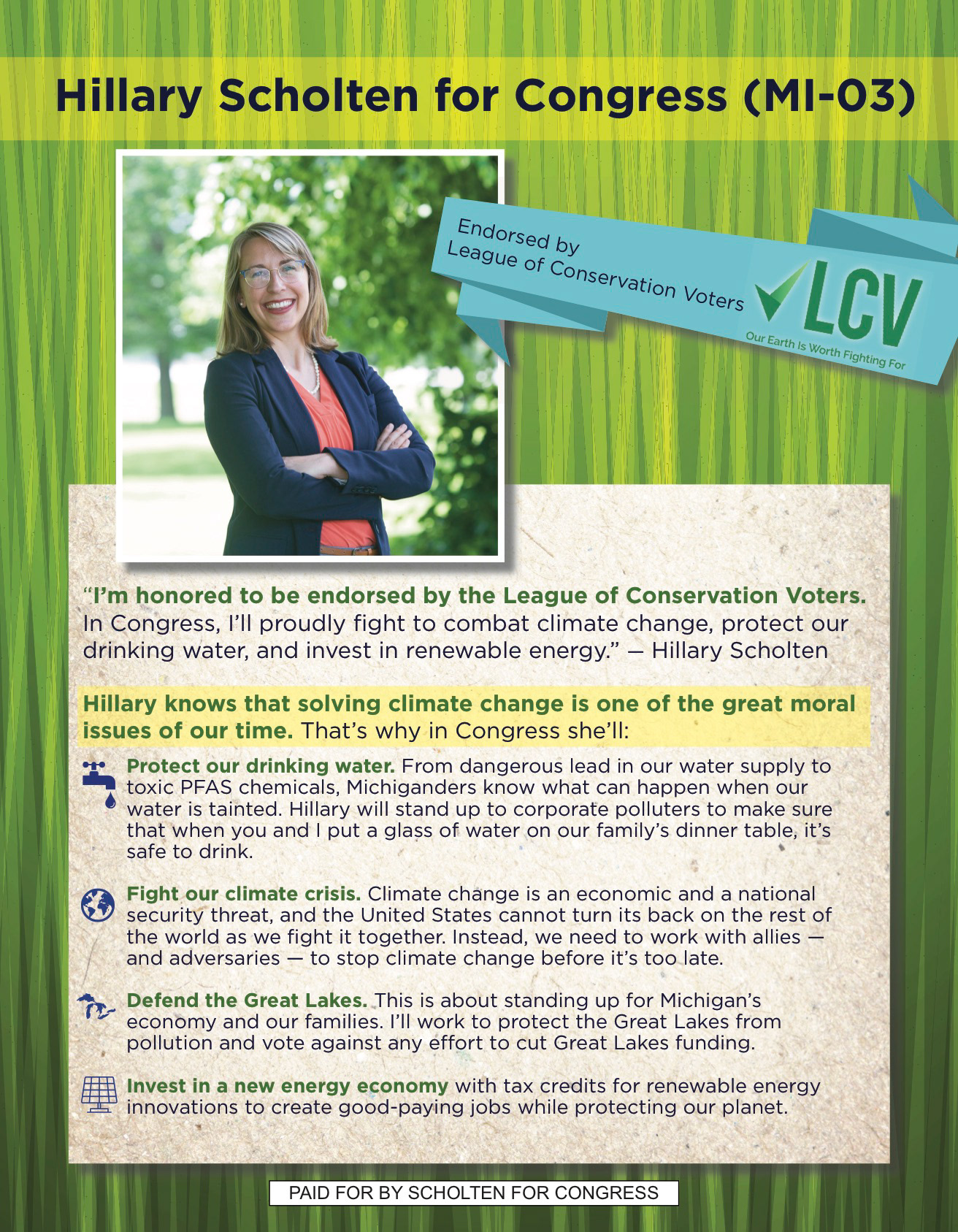 Congressional candidate Hillary Scholten wanted a mailer to advertise her endorsement by the League of Conservation Voters and emphasize the pro-climate aspects of her platform.